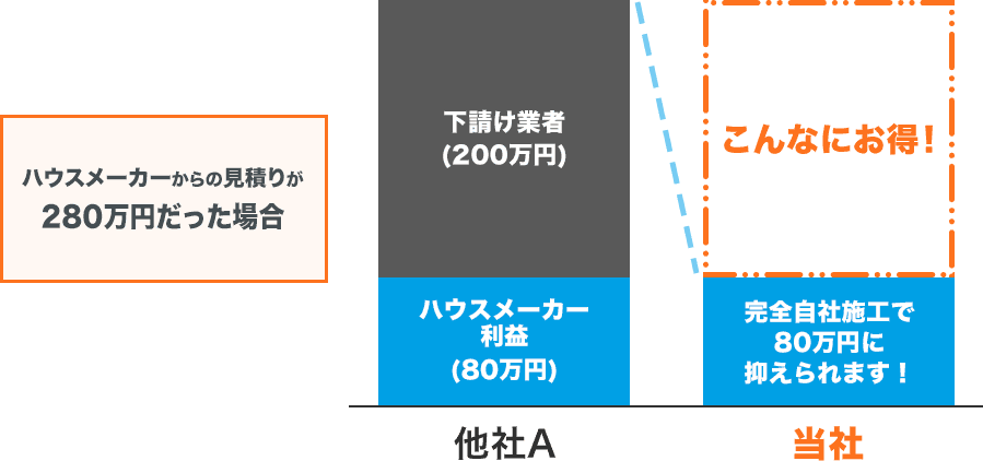 工事は迅速で丁寧に行われ、最初に住宅メーカーでもらった見積もりよりもかなり安く済み、大変満足しています。